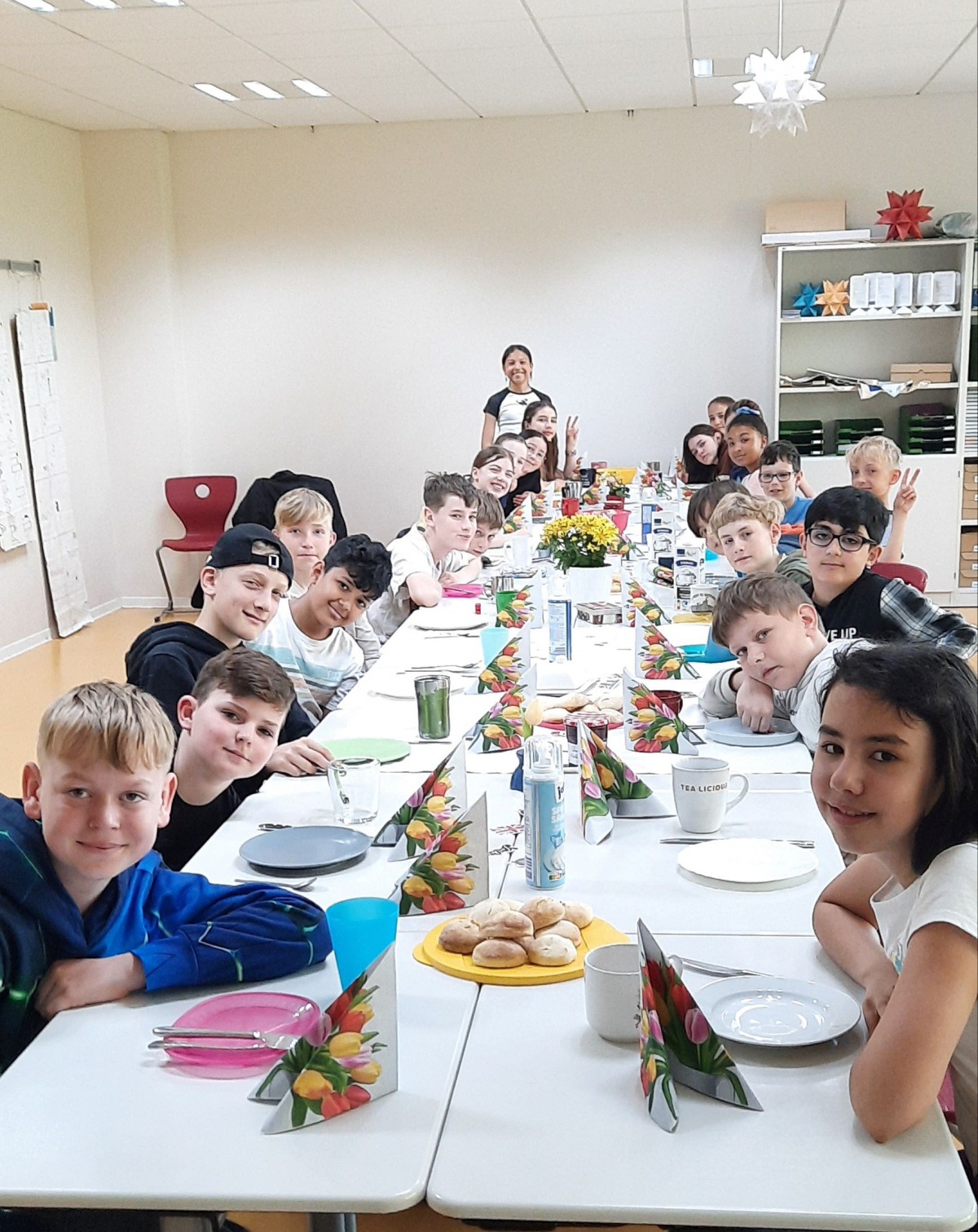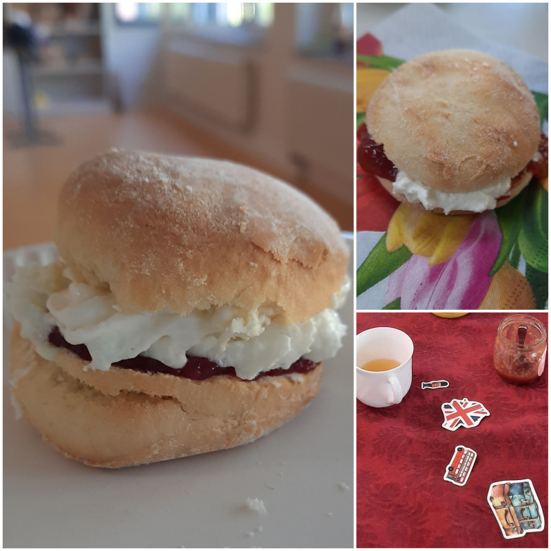 Frisch gebackene Scones, zum Teil selbst gemachte Himbeer- und Erdbeermarmelade, Tischdekoration usw. brachten die Schüler*innen der 5d und 5c am 02. bzw. 06.05.25 mit in die Schule. An einer großen Tafel zelebrierten sie eine typisch britische Cream Tea Party, natürlich mit original Clotted Cream und Afternoon Tea. Sehr lecker! Die schönsten Scones mit wurden prämiert.