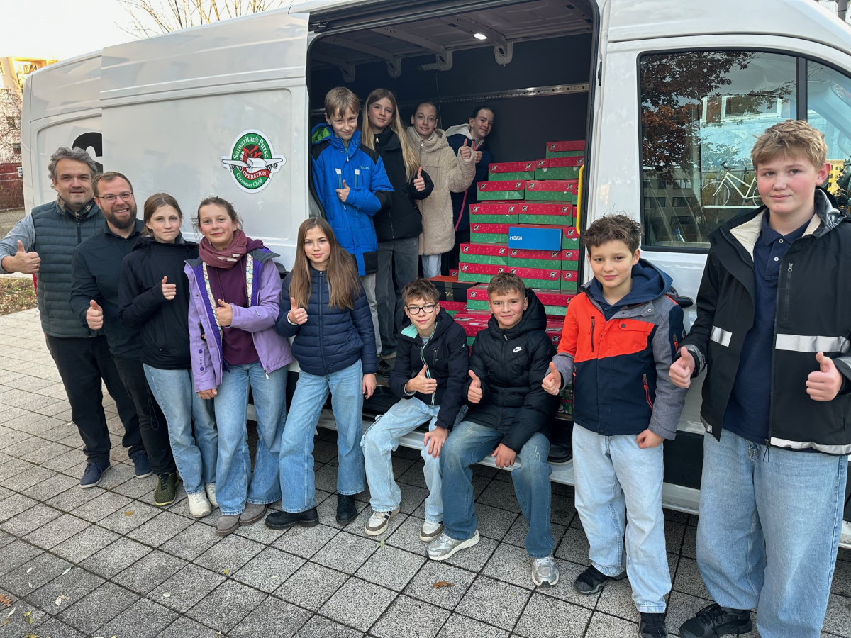 Schülerinnen und Schüler senden 128 liebevoll gepackte Kartons mit Weihnachtsbotschaften an bedürftige Kinder in die ganze Welt.