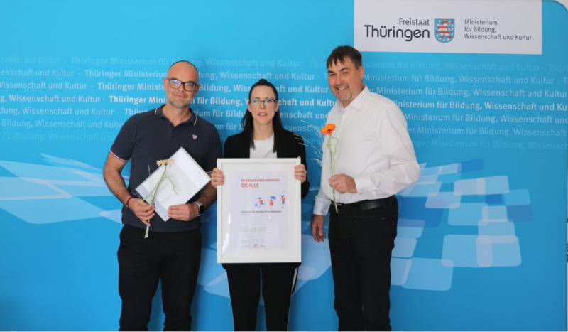 Am Donnerstag, 18. September 2025, erhielt unsere Schule als eine von zehn thüringischen Schulen die Auszeichnung „Bewegungsfördernde Schule“ für das Schuljahr 2024/2025. Die Verleihung fand in der Staatlichen Gemeinschaftsschule Friedrich von Hardenberg in Greußen statt.