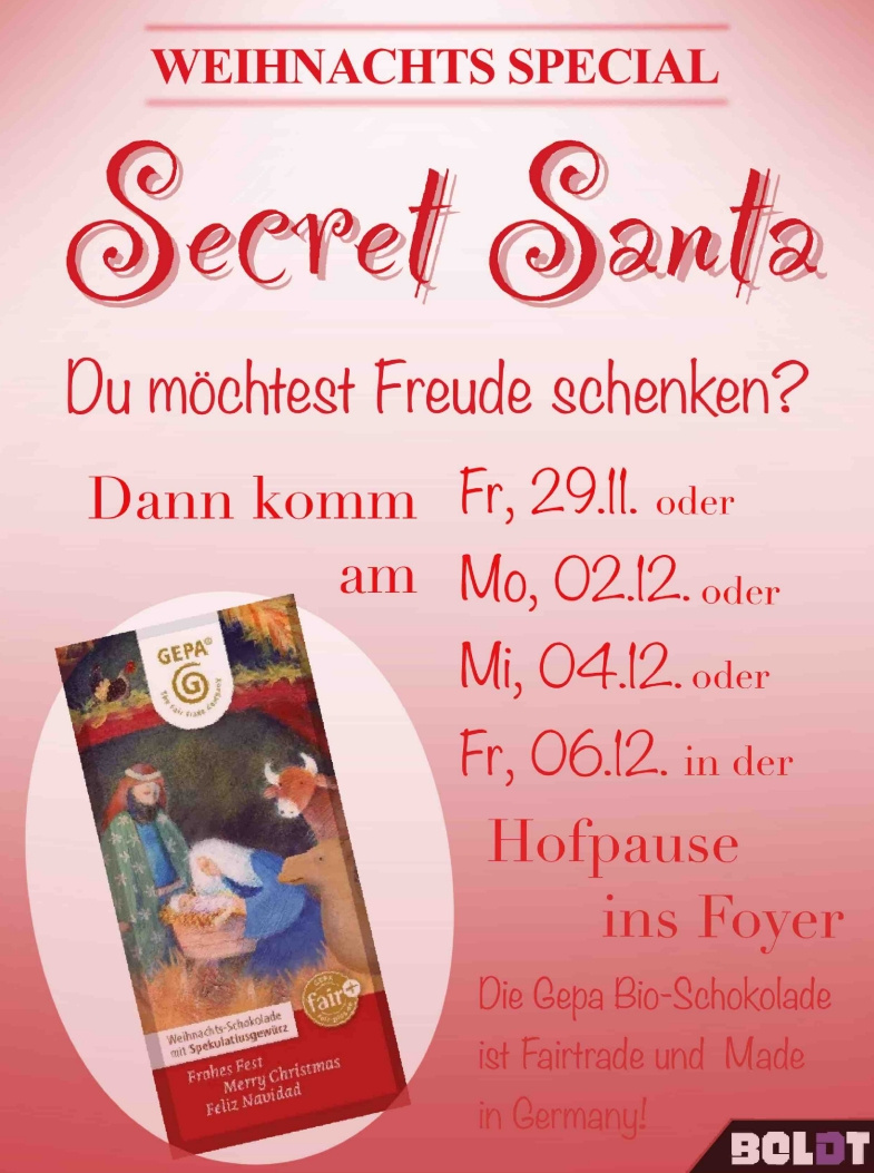 Die Schülerfirma BOLDT organisiert an unserer Schule gerade ein Mitmachprojekt mit dem Namen “Secret Santa”. Ziel ist es dabei, die Schulgemeinschaft klassen- und jahrgangsübergreifend zu stärken sowie ebenso in der vorweihnachtlichen Zeit individualisiert Freude zu verbreiten.