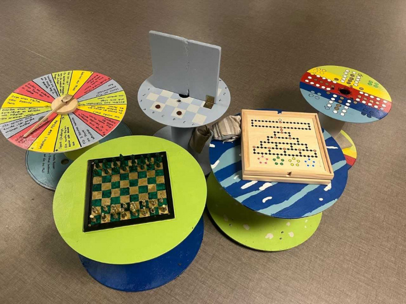 Im Rahmen eines kleinen Ferienprojektes wurden vom 30. Juni bis 2. Juli aus alten Kabeltrommeln kreative Spieltische gebaut. Entstanden sind vier gestaltete Tische für die Spiele Mensch ärgere dich nicht, Schiffe versenken, Schach und Activity, sowie ein weiterer vielseitig nutzbarer Tisch.